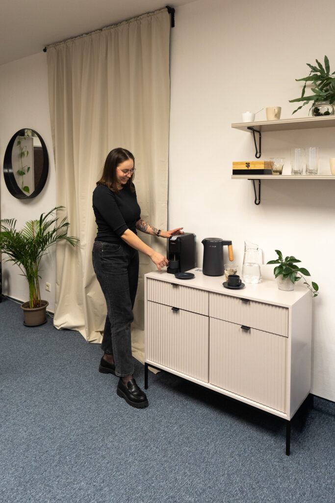 Kancelář je plně vybavená pro konzultace. Najdete v ní pohodlné sezení, stolečky i psací stůl s psacími potřebami. Můžete využít wifi i náš vybavený kuchyňský kout s kávovarem a rychlovarnou konvicí. Myslíme i na sociální zázemí, které je sdíleno na patře a od kanceláře doslova pár kroků.